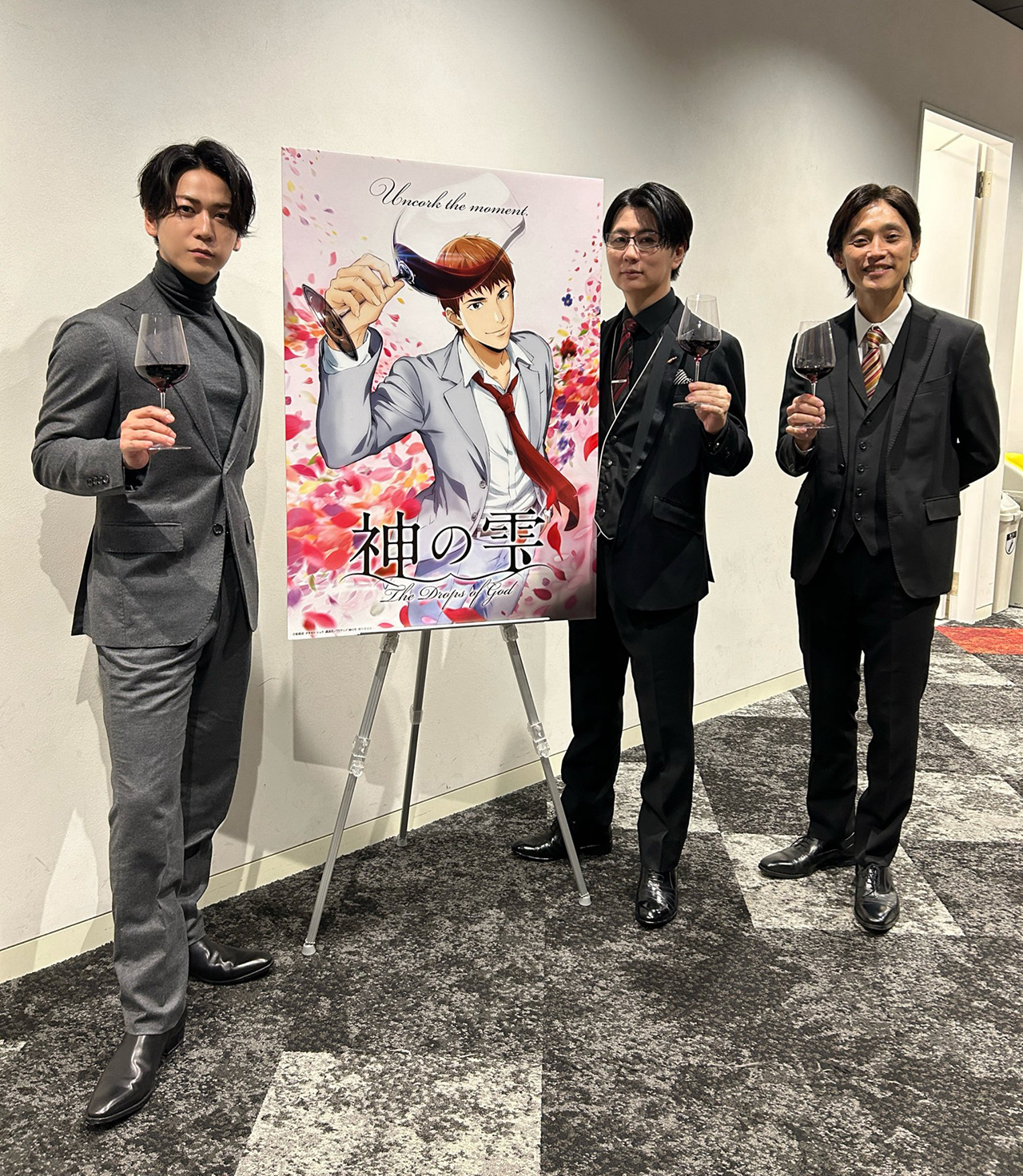 この日はボージョレ・ヌーヴォー解禁日ということで、フォトセッション時に使用するワインは、亀梨が開けることに。用意されたワインは、本作のワイン監修を務めるモトックス・本間氏の手配による「ボージョレ ヌーヴォ キュヴェ・ヴィエイユ・ヴィーニュ」。本間氏は、原作にも登場する本間長介のモデルでもあり、亀梨がトーク中にお気に入りのキャラクターとしてあげた人物だ。そして、最後に糸曽監督がグラスを掲げ「ではスタッフ・キャストそして本日お越しいただきました皆様の健康とアニメ『神の雫』の無事の完成と成功を祈りまして…『Santé ! (サンテ!)』」の掛け声で、亀梨と笑顔で乾杯をし、イベントをしめくくった。
